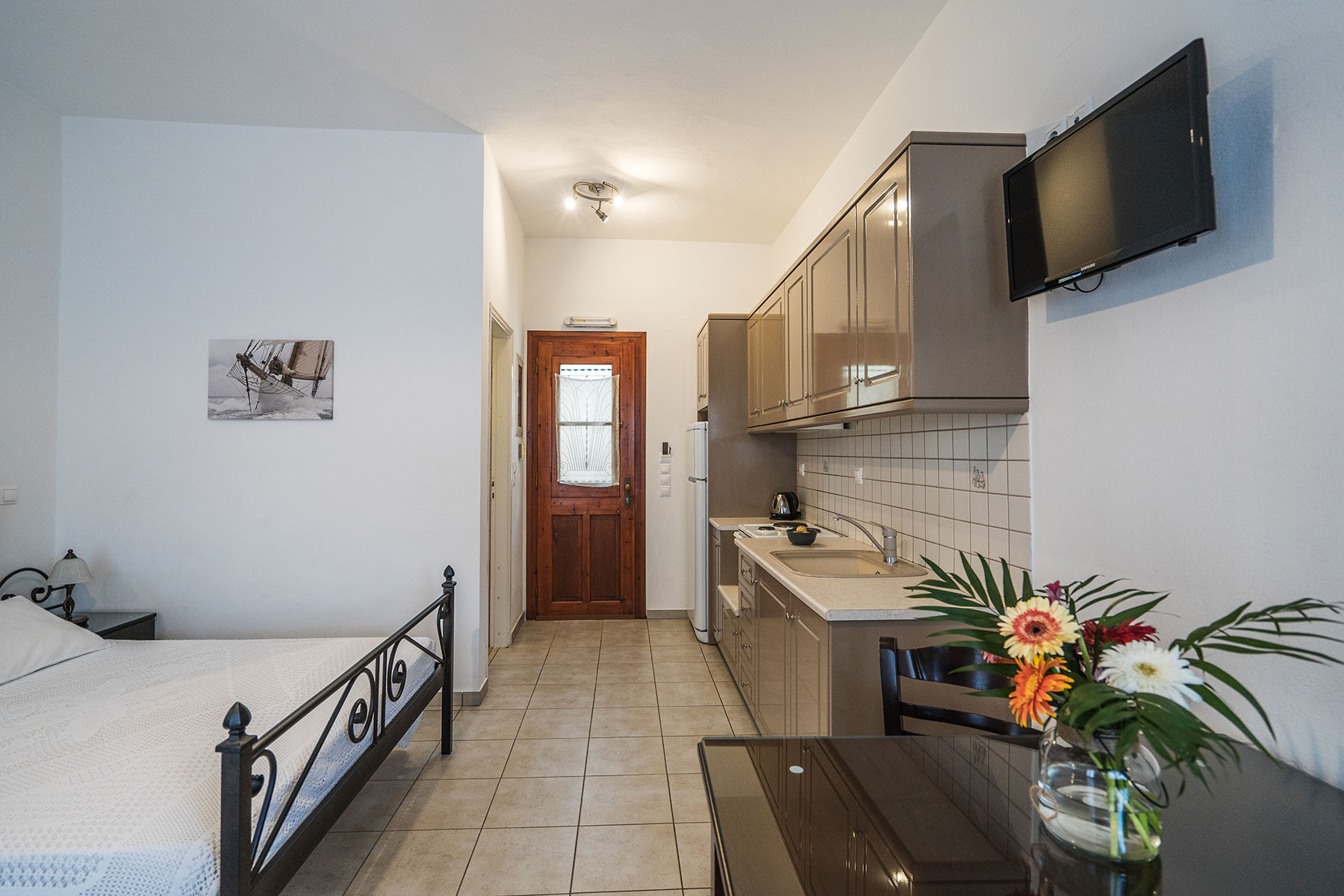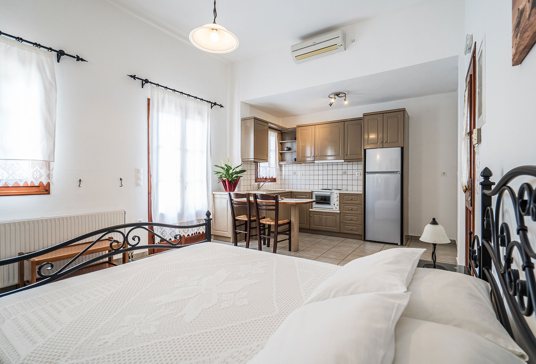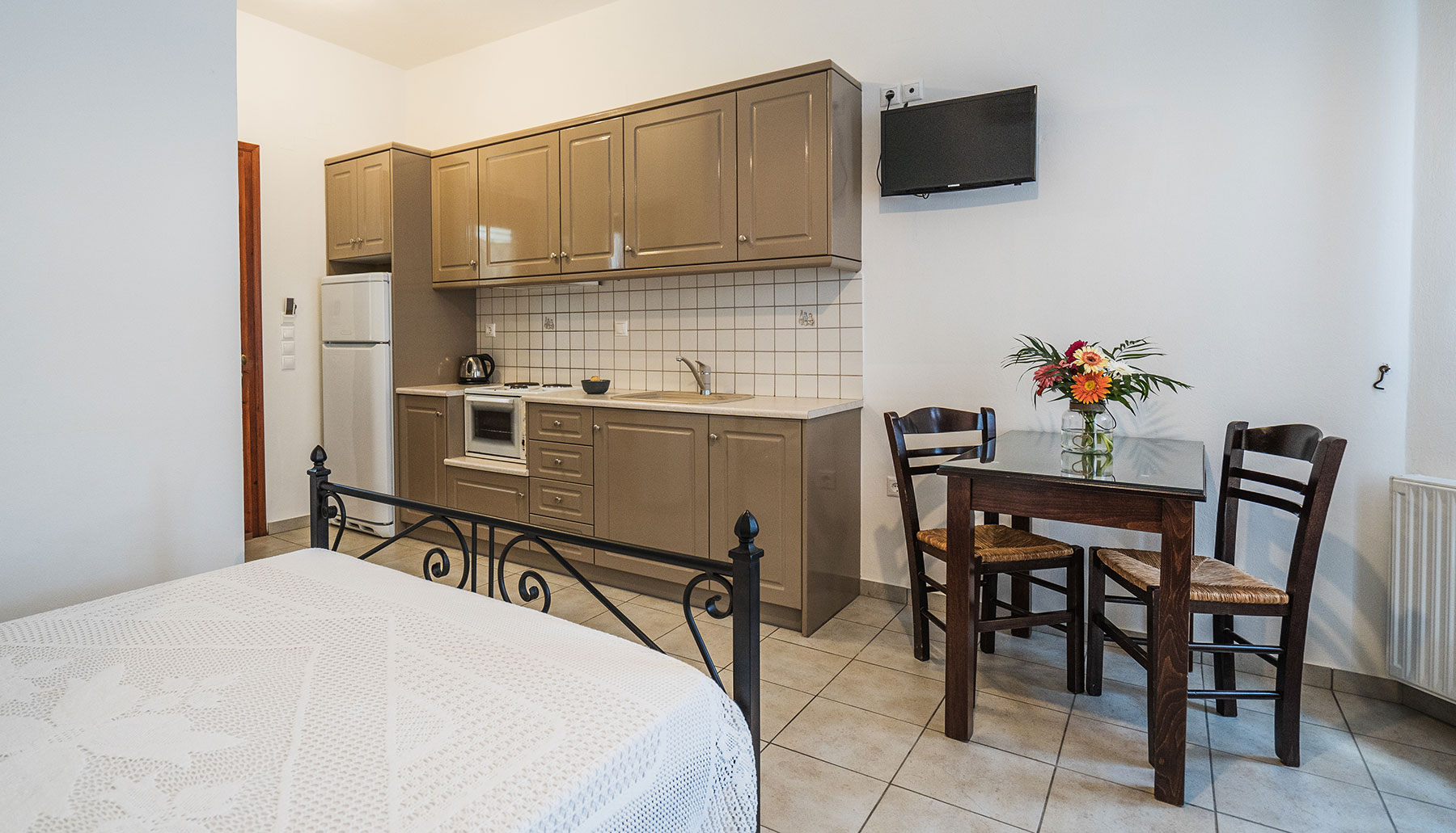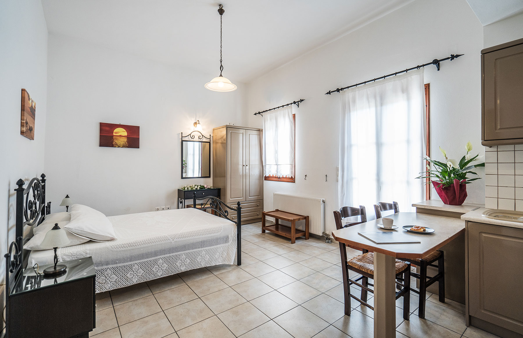 Τα μονόχωρα διαμερίσματά μας διαθέτουν κουζίνα, τραπέζι φαγητού, διπλό κρεβάτι, μπάνιο και μεγάλη πλακόστρωτη αυλή.