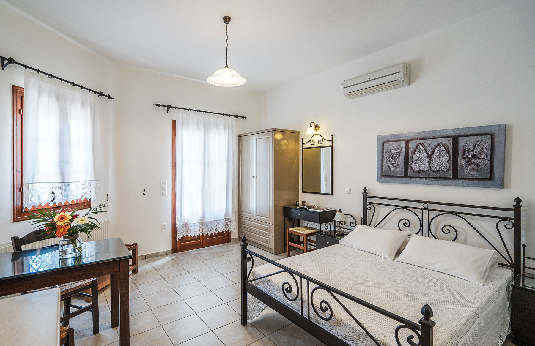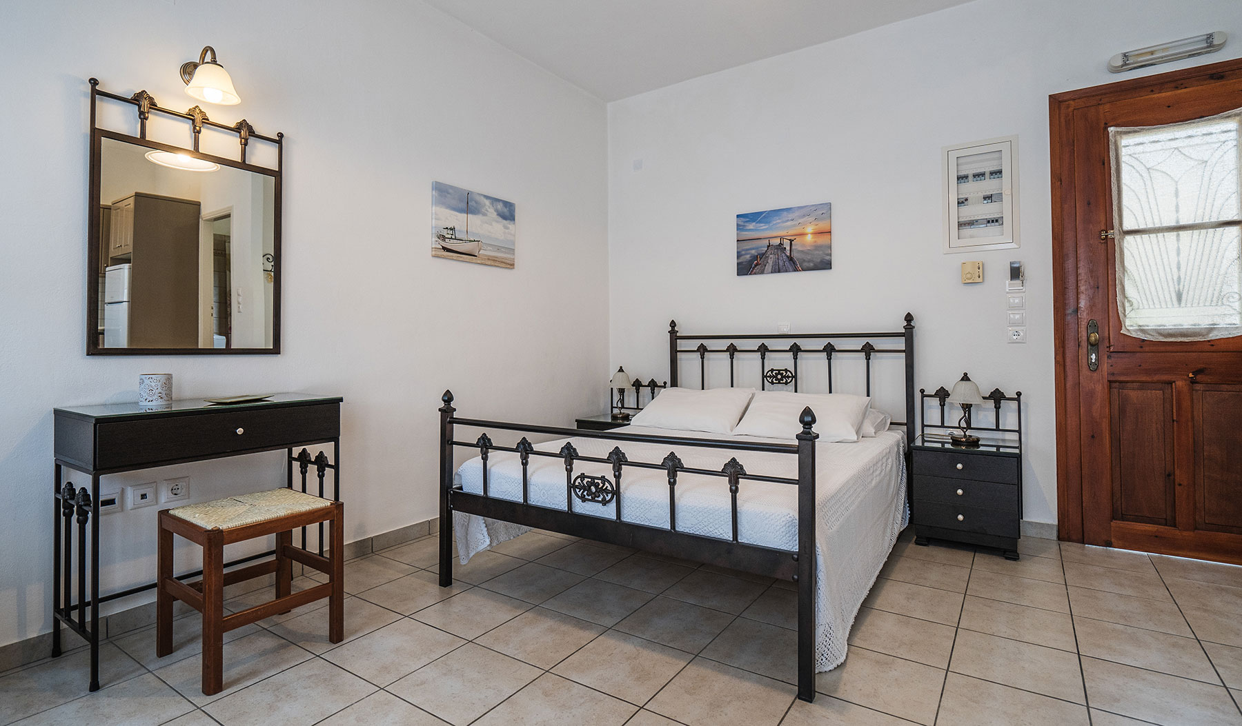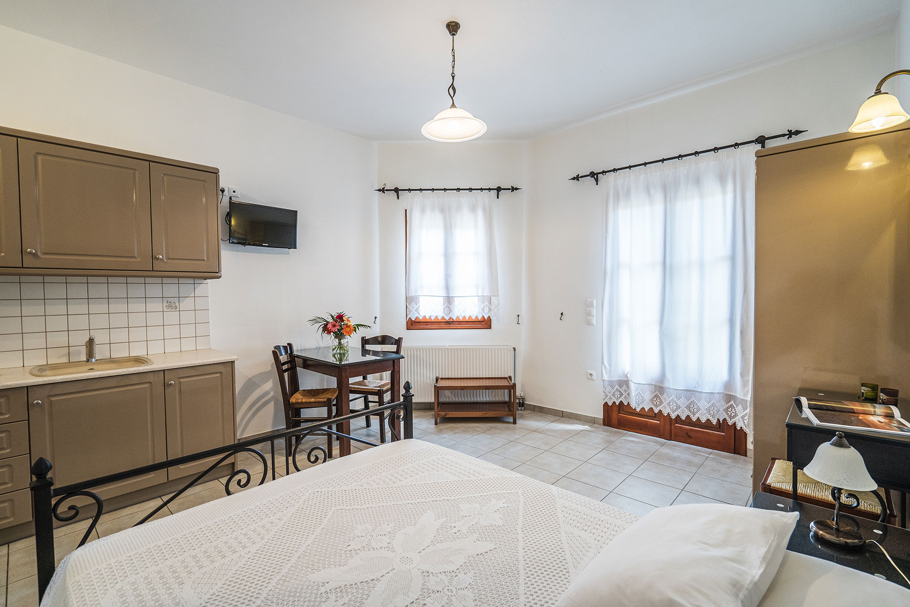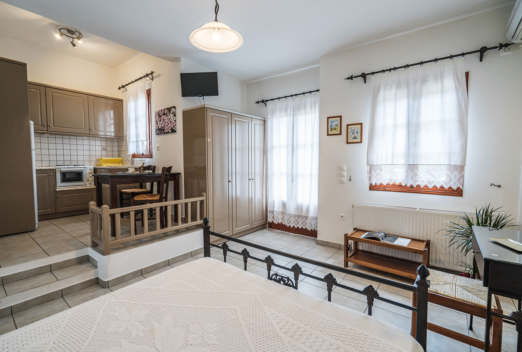Τα μονόχωρα διαμερίσματά μας διαθέτουν κουζίνα, τραπέζι φαγητού, διπλό κρεβάτι, μπάνιο και μεγάλη πλακόστρωτη αυλή.