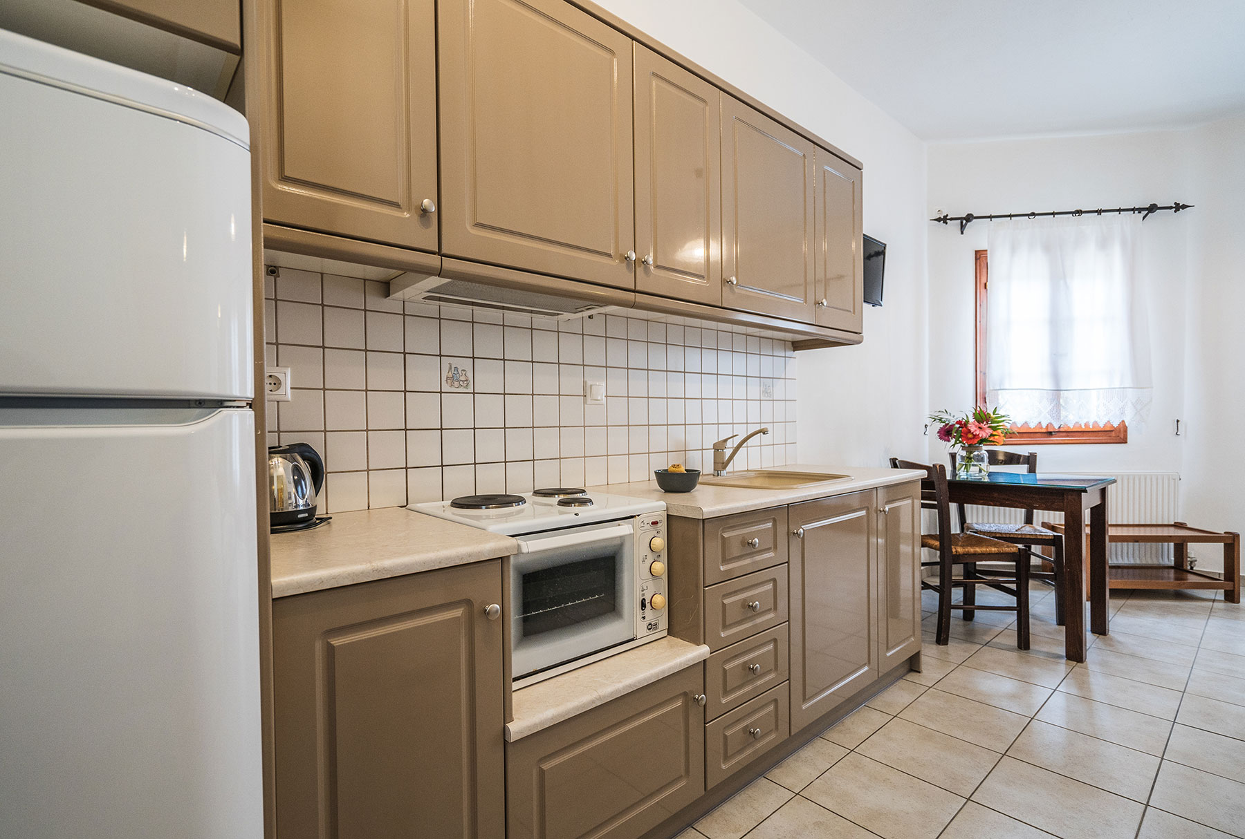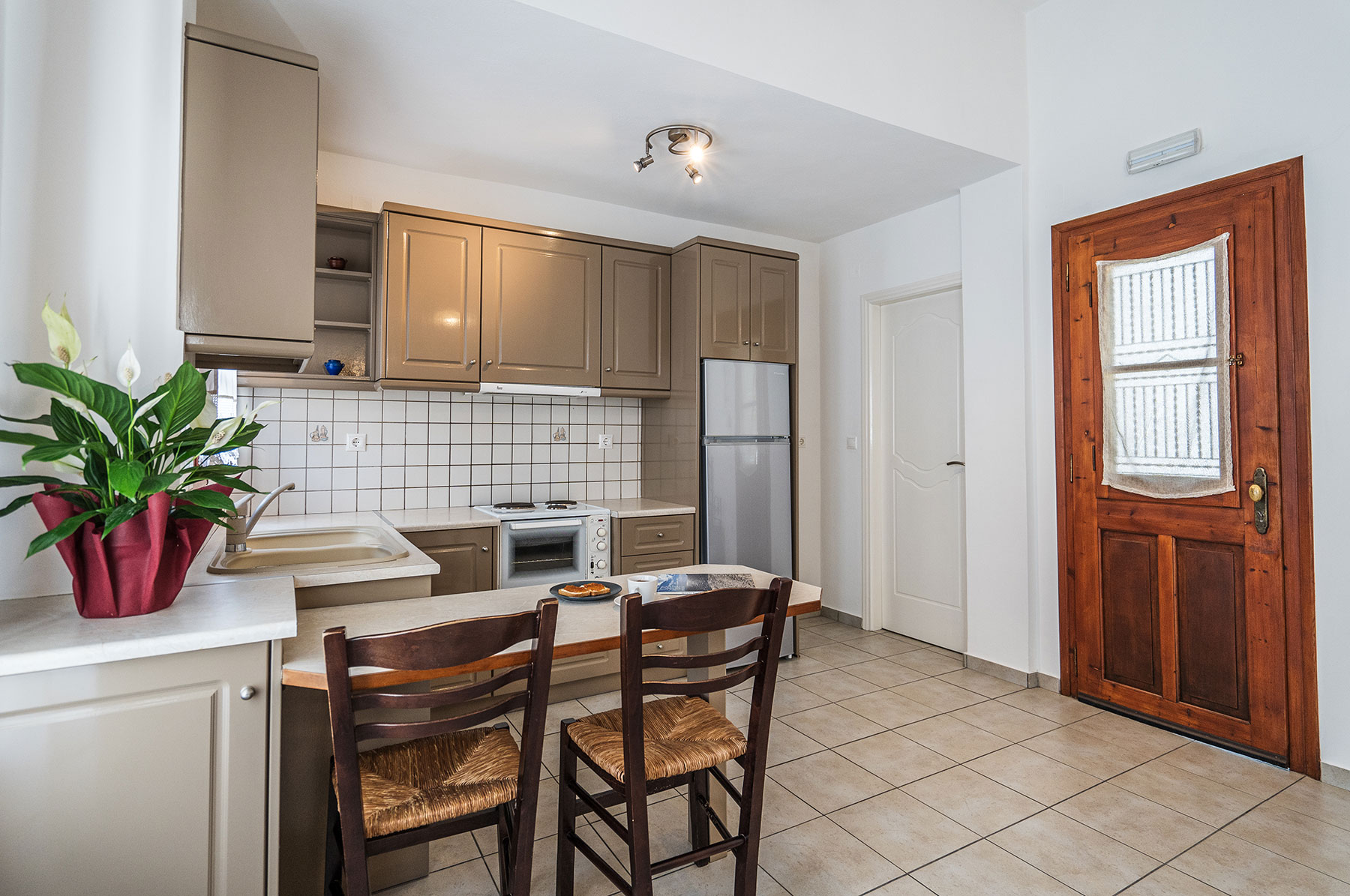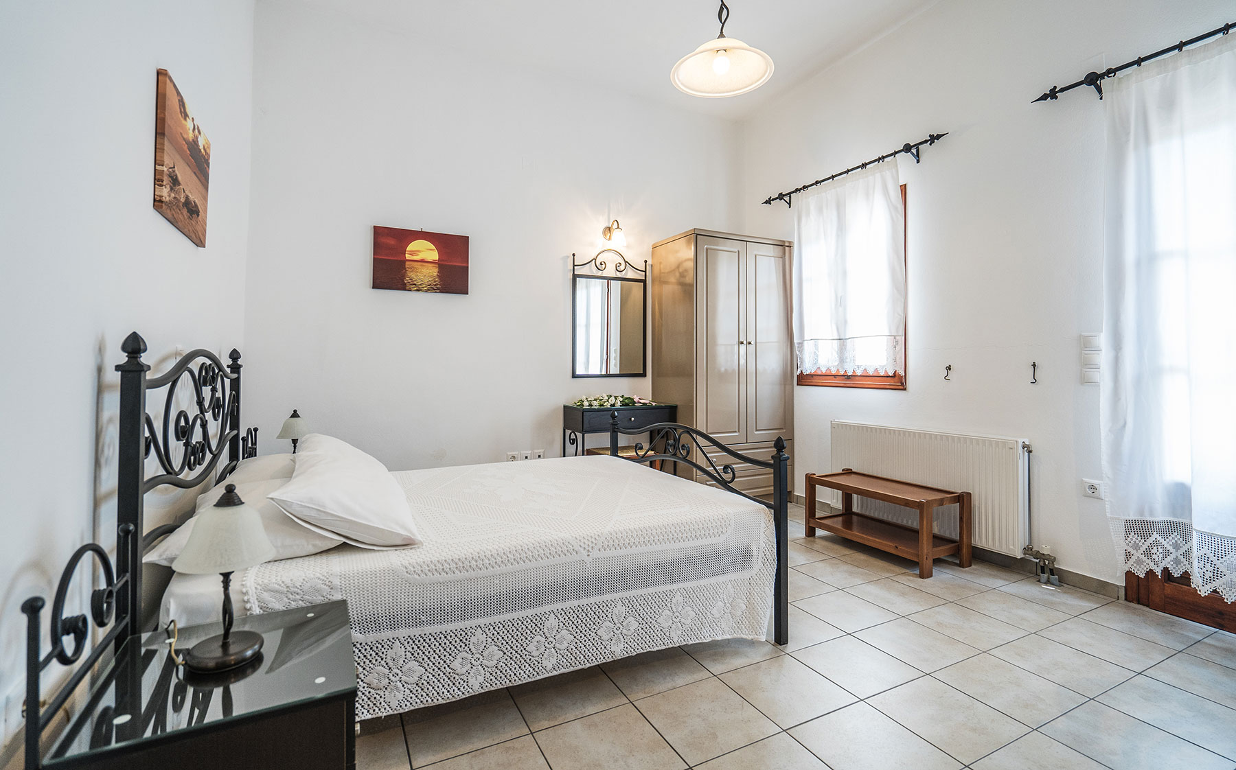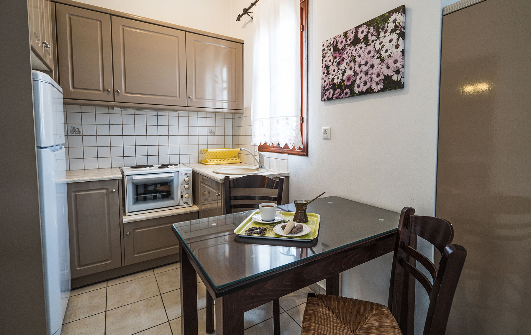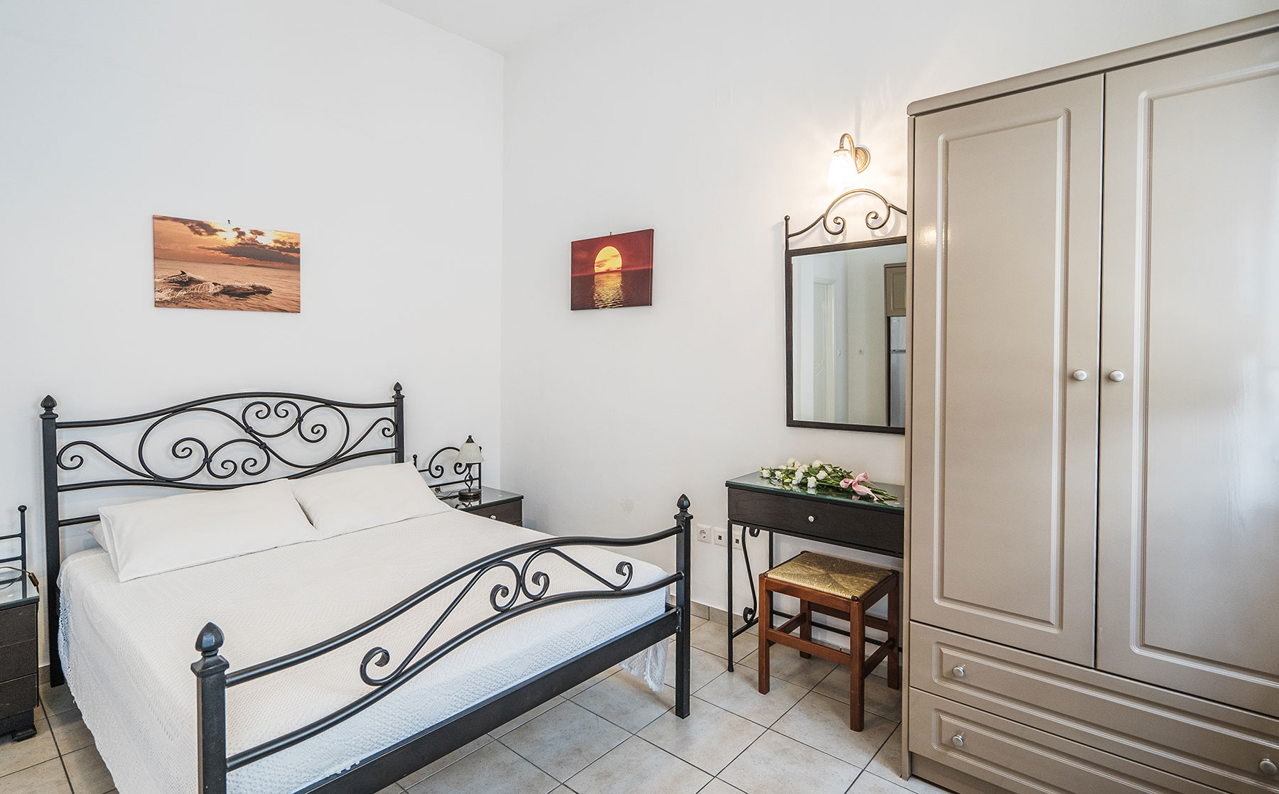 Τα μονόχωρα διαμερίσματά μας διαθέτουν κουζίνα, τραπέζι φαγητού, διπλό κρεβάτι, μπάνιο και μεγάλη πλακόστρωτη αυλή.