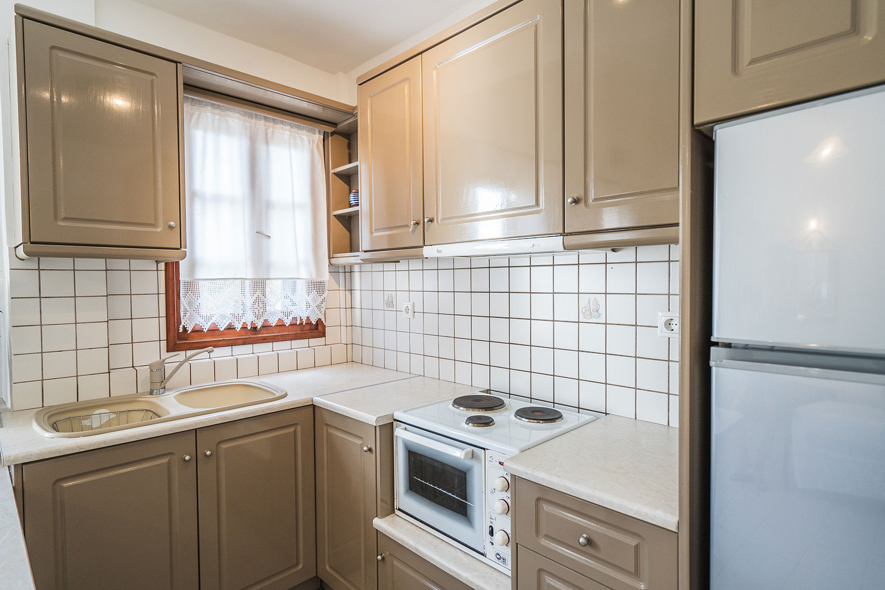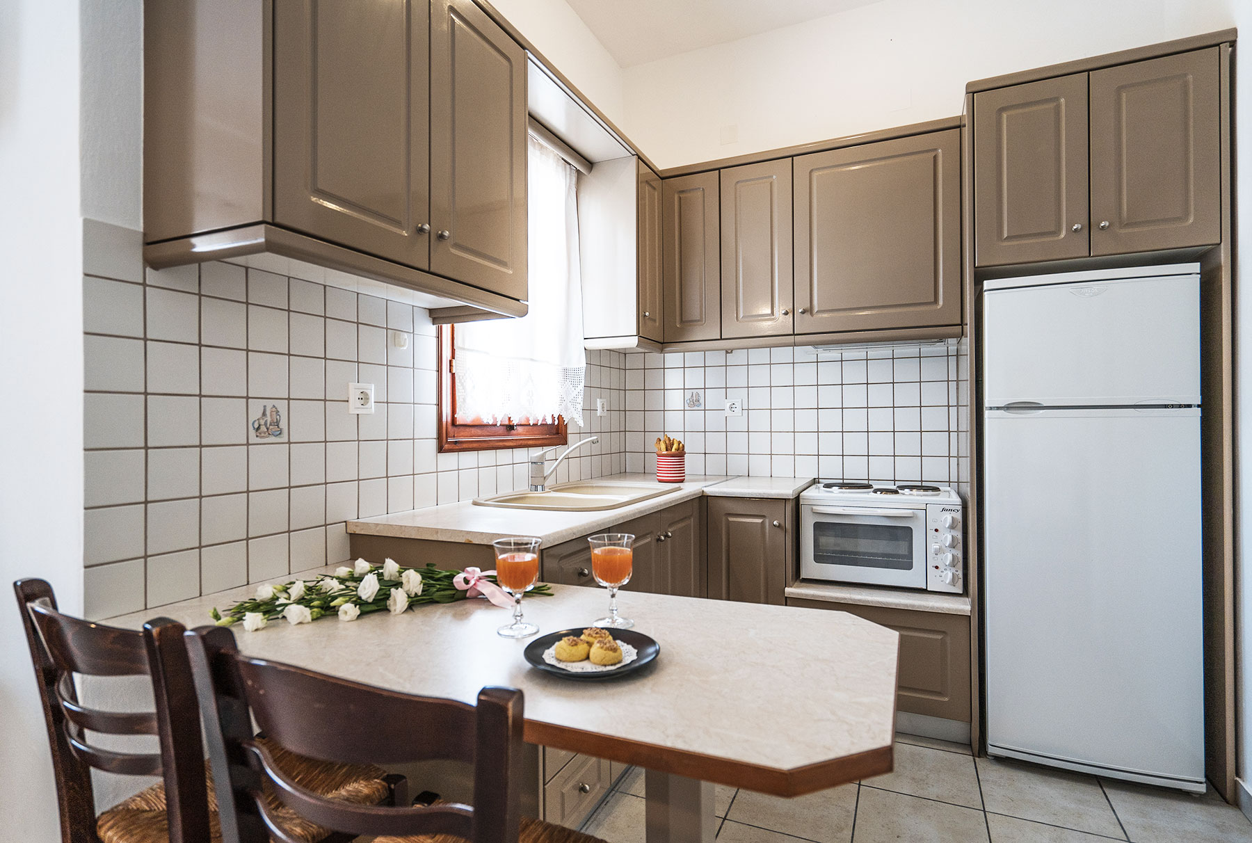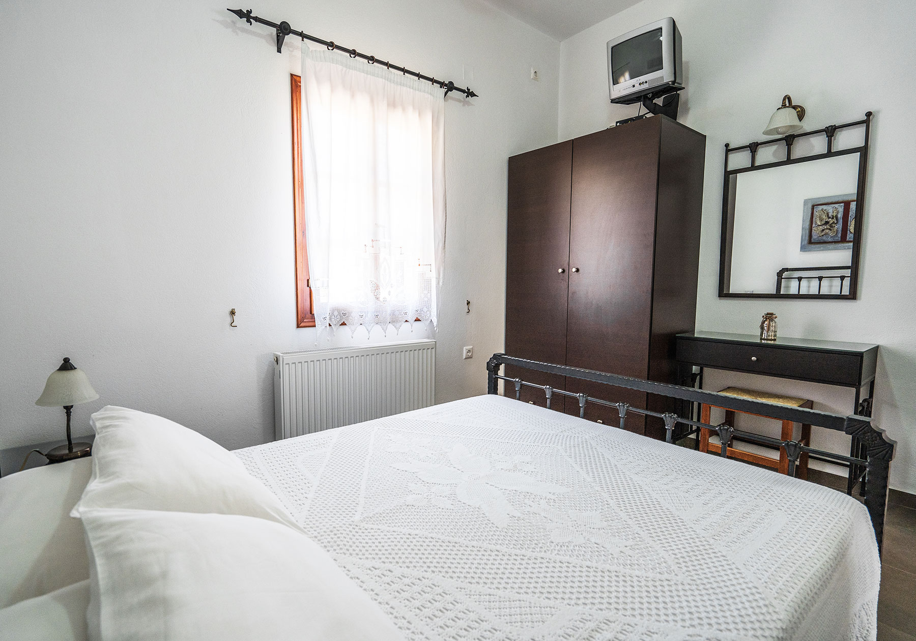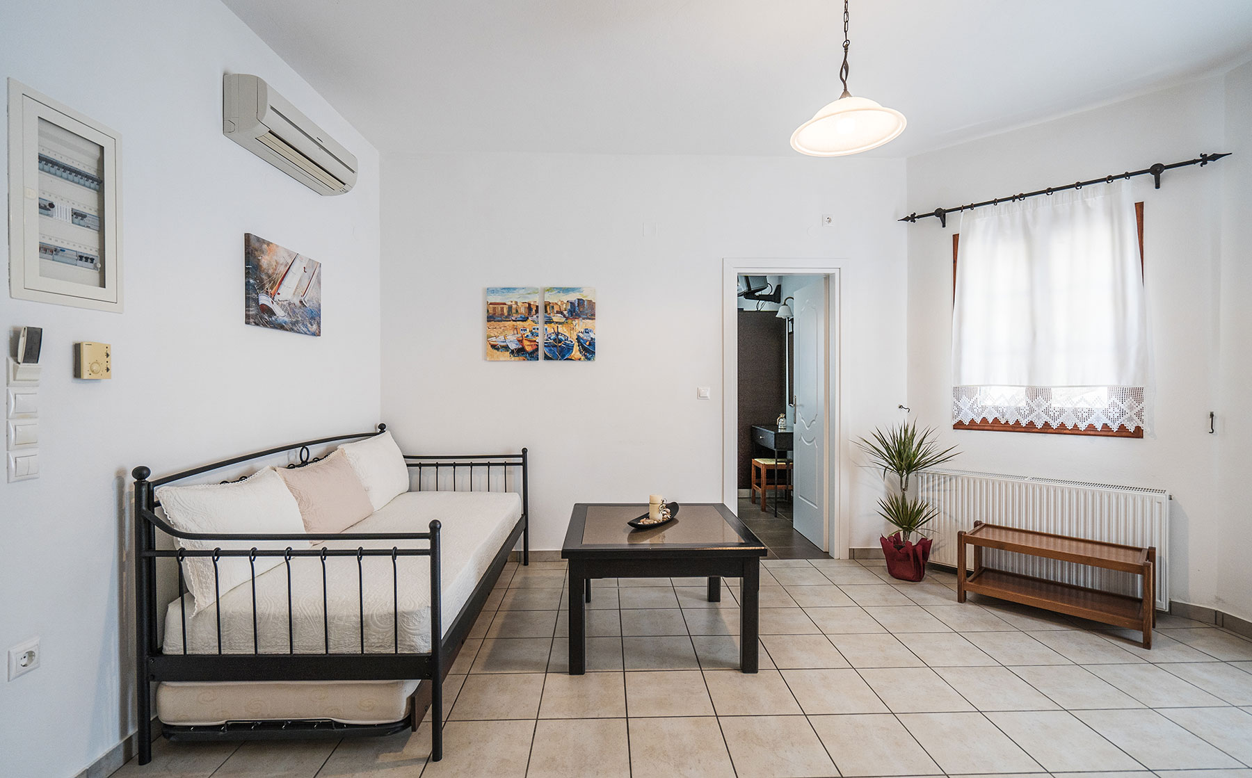 Το δίχωρο διαμέρισμά μας διαθέτει κουζίνα, τραπέζι φαγητού, μπάνιο και μεγάλη εξωτερική αυλή. Έχει ένα υπνοδωμάτιο με διπλό κρεβάτι και στο ευρύχωρο σαλόνι έναν καναπέ που μετατρέπεται σε 2 μονά κρεβάτια.